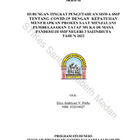 - Hubungan Tingkat Pengetahuan Siswa SMP Tentang Covid-19 dengan Kepatuhan Menerapkan Prokes Saat Menjalani Pembelajaran Tatap Muka Di Masa Pandemi Di SMP Negeri 3 Saitnihuta Tahun 2022