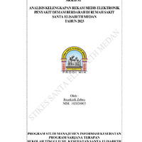 meningkatkan mutu pelayanan kesehatan, memberikan kepastian hukum dalam penyelenggaraan dan pengelolaan rekam medis, menjamin keamanan, kerahasiaan, keutuhan, dan ketersediaan data rekam medis, mewujudkan penyelenggaraan dan pengelolaan rekam medis yang berbasis digital dan terintegrasi. Tujuan Penelitian ini adalah untuk menganalisis kelengkapan berkas rekam medis pasien demam berdarah pada lembar identitas pasien, anamnesis, informed consent, Resume medis di Rumah Sakit Santa Elisabeth Medan Tahun 2023. Jenis penelitian yang digunakan adalah penelitian deskriptif. Sampel pada penelitian ini adalah sebanyak 76 rekam medis. Pengambilan sampel dilakukan