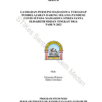 - Munculnya corona virus telah banyak menarik perhatian global, dan Pada 30 Januari WHO telah menyatakan COVID-19 sebagai darurat kesehatan masyarakat yang menjadi perhatian internasional. Penambahan jumlah kasus COVID-19 berlangsung cukup sangat cepat dan sudah terjadi penyebaran antar negara. Sampai dengan tanggal 25 Maret 2020, dilaporkan total kasus konfirmasi 414.179 dengan 18.440 kematian (CFR 4,4%) akhirnya Menteri Pendidikan Nadiem Anwar Makarim, menerbitkan Surat Edaran Nomor 4 Tahun 2020 pada Satuan Pendidikan dan Nomor 36962/MPK.A/HK/2020 tentang Pelaksanaan Pendidikan dalam Masa Darurat Coronavirus Disease (COVID-19) yang memberikan arahan bahwa kegiatan belajar mengajar oleh peserta didik dilakukan secara daring (online) dalam rangka pencegahan penyebaran virus corona. Pembelajaran online menghubungkan pembelajar (peserta didik) dengan sumber belajarnya (database, pakar/instruktur, perpustakaan) yang secara fisik terpisah atau bahkan berjauhan namun dapat saling berkomunikasi, berinteraksi atau berkolaborasi. Penellitian ini dimaksud bertujuan untuk mengetahui Gambaran Persepsi Mahasiswa Terhadap Pembelajaran Daring Selama Pandemi Covid Pada Mahasiswa STIkes Elisabeth Medan Tingkat Tiga Tahun 2022. Metode penelitian yang digunakan adalah deskriptif. Pengambilan sampel mengunakan teknik total sampling sebanyak 150 responden. Hasil penelitian ini menunjukan bahwa responden berada pada kategori persepsi mahasiswa terhadap pembelajaran daring baik 77 (51,3%), aspek pengalaman belajar 88 responden (58,7%), aspek kapabilitas dosen 103 responden (68,7%) dan aspek sarana dan prasarana 84 responden ( 56,0%). Berdasarkan hasil penelitian jumlah sampel 150 orang responden mengenai Gambaran Persepsi Mahasiswa Terhadap Pembelajaran Daring Selama pademi covid Pada Mahasiswa STIKes Santa Elisabeth Medan Tingkat Tiga tahun 2022 maka dapat disimpulkan Baik.