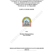 Pneumonia merupakan infeksi akut pada paru-paru yang dapat menyebabkan gangguan oksigenasi serius hingga kematian, terutama pada lansia yang mengalami penurunan fungsi organ dan daya tahan tubuh. Berdasarkan data WHO dan Kementerian Kesehatan RI, pneumonia merupakan penyebab utama kematian akibat infeksi di dunia. Di Indonesia, tercatat lebih dari 300 ribu kasus pneumonia dengan tingkat kejadian tertinggi di provinsi Sumatera Utara, dan kota Medan sebagai penyumbang terbanyak. Penulisan karya ilmiah ini bertujuan untuk menerapkan asuhan keperawatan secara sistematis kepada pasien dengan gangguan sistem pernapasan pneumonia melalui lima tahapan: pengkajian, penetapan diagnosa keperawatan, perencanaan, pelaksanaan tindakan, dan evaluasi. Metode yang digunakan adalah studi kasus pada pasien bernama Nn. H, seorang lansia berusia 80 tahun, yang dirawat di ruang Pauline Rumah Sakit Santa Elisabeth Medan pada tanggal 24–26 Maret 2025. Pasien datang dengan keluhan sesak napas, batuk berdahak berwarna kuning, demam naik-turun, serta sulit tidur karena sesak yang mengganggu. Pemeriksaan fisik menunjukkan suhu tubuh 38,6°C, frekuensi napas 26x/menit, penggunaan otot bantu napas, serta adanya ronchi pada paru-paru. Diagnosa medis yang ditegakkan adalah bronkopneumonia. Berdasarkan pengkajian keperawatan, penulis mengidentifikasi beberapa diagnosa keperawatan utama, yaitu: (1) bersihan jalan napas tidak efektif, (2) hipertermia, (3) gangguan pola tidur, dan (4) intoleransi aktivitas. Selain itu, terdapat diagnosis defisit nutrisi yang tidak dijadikan prioritas karena kondisi pasien yang stabil secara metabolik. Setiap diagnosa ditindaklanjuti dengan perencanaan intervensi keperawatan sesuai standar SIKI (Standar Intervensi Keperawatan Indonesia) dan ditujukan untuk mengatasi gejala serta mendukung proses penyembuhan pasien. Intervensi keperawatan yang dilakukan antara lain adalah manajemen jalan napas dengan menjaga posisi semi-fowler, melakukan penghisapan sekret bila diperlukan, memberikan oksigen tambahan, dan edukasi hidrasi adekuat. Untuk penanganan hipertermia, dilakukan pengukuran suhu rutin, pemberian kompres hangat, pemberian cairan oral, dan pemantauan keseimbangan cairan. Bersihan jalan nafas ditangani dengan observasi pola napas, pemberian oksigen,fisiotherapi dada serta teknik batuk efektif. Seluruh tindakan dilakukan melalui