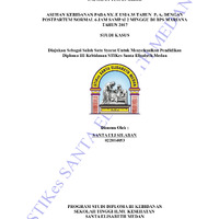 - Menurut WHO tahun 2012, 81% angka kematian ibu (AKI ) akibatkomplikasi selama hamil dan bersalin, dan 25% selama masa post partum. Penyebab kematian ibu di Sumatera Utara disebabkan oleh perdarahan 33 %, eklampsia 28%, lainnya 27 %, infeksi 6,6 %, partus macet 3,3 %, dan abortus 2%. Tujuan: Mampu memberikan asuhan kebidanan pada Ny. E usia 35 tahun P5A0 postpartum normal 6 jam sampai 2 minggu di BPS Mariana tahun 2017 yang didokumentasikan melalui manajemen kebidanan varney dan SOAP. Metode: Jenis penelitian ini dengan cara deskriptif dengan kualitatif metode study kasus dengan tujuan untuk melihat fenomena perbedaan dan persamaan secara umum antara teori dengan praktek pada post partum normal. Hasil: Hasil dari asuhan kebidanan yang diberikan pada Ny. E dengan postpartum normal 6 jam sampai 2 minggu dilakukan asuhan kunjungan ibu nifas sebanyak 3 kali. Berdasarkan kunjungan yang dilakukan, asuhan kunjungan ibu nifas dilakukan sampai masalah teratasi. Asuhan kebidanan yang diberikan pada Ny. E dengan postpartum normal 6 jam sampai 2 minggu masalah teratasi. Kunjungan yang dilakukan sebanyak 3 kali, asuhan dilakukan sesuai dengan teori