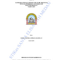 ASI eksklusif adalah bayi yang hanya diberi ASI saja tanpa tambahancairan lain seperti susu formula, jeruk, madu, air teh, air putih, dan tambahan makanan padat seperti pisang, pepaya, bubur susu, biskuit, bubur nasi dan tim. Data pemantauan status gizi di Indonesia pada 2017 menunjukkan cakupan pemberian ASI secaraeksklusif selama 6 bulan pertama oleh ibu kepada bayinya masih sangat rendah yakni 35,7%. Tujuan penelitian ini dilakukan yaitu untuk mengetahui tingkatpengetahuan ibu berdasarkan umur, pendidikan, pekerjaan, dan paritas. Penelitian ini bersifat deskriptif dan populasi yang diambil sebanyak 36 ibu menyusui. Pengambilan data dilakukan dengan teknik Non Probability Sampling dengan metode Purposive Sampling dan dilakukan dengan cara wawancara langsung STIKes SANTA ELISABETH MEDAN xx kepada responden dibantu dengan kuesioner. Analisa data dilakukan dengan analisis univariat. Hasil penelitian tentang tingkat pengetahuan ibu terhadap pemberian ASI eksklusif ada usia 0-6 bulan di Klinik Romana Tahun 2019 didapatkan sebagian besar ibu berpengetahuan cukup yaitu sebanyak 19 orang (52,8%), berdasarkan umur sebagian besar 20-35 tahun sebanyak 33 orang (91,7%), berdasarkan pedidikan sebagian besar SMA sebanyak 27 orang (75%), berdasarkan pekerjaan sebagian besar bekerja sebagai IRT sebanyak 25 orang (69,4%), berdasarkan paritas sebagian besar ibu multipara sebanyak 22 orang (61,1%). Dari hasil data diatas penulis menyimpulkan bahwa pengetahuan ibu ibu di Klinik Romana memiliki pengetahuan yang cukup tentang ASI eksklusif. Diharapkan pada ibu lebih termotivasi memberikan ASI Eksklusif pada bayi usia 0-6 bulan tanpa tambahan makanan apapun.