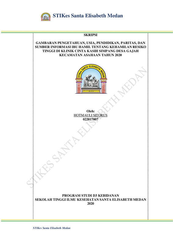 Gambaran Pengetahuan, usia, pendidikan, paritas, dan sumber informasi ibu hamil tentang kehamilan resiko tinggi di klinik cinta kasih simpang desa gaja Kec.Asahaan Tahun 2020