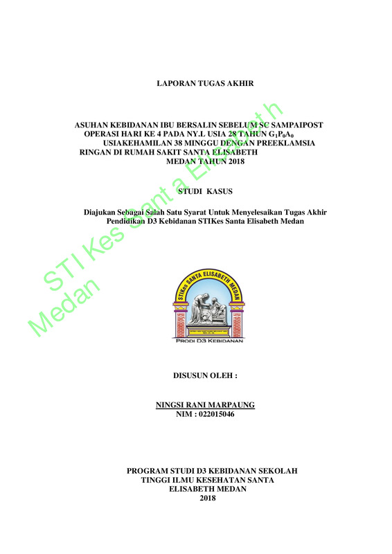 Asuhan Kebidanan Ibu Bersalin Sebelum Sc Sampai Post Operasi Hari Ke 4 Pada Ny. L Usia 28 Tahun G1P0A0 Usia Kehamilan 38 MingguDengan Pre Eklamsia Ringan Di Rumah Sakit Santa Elisabeth Medan Tahun 2018