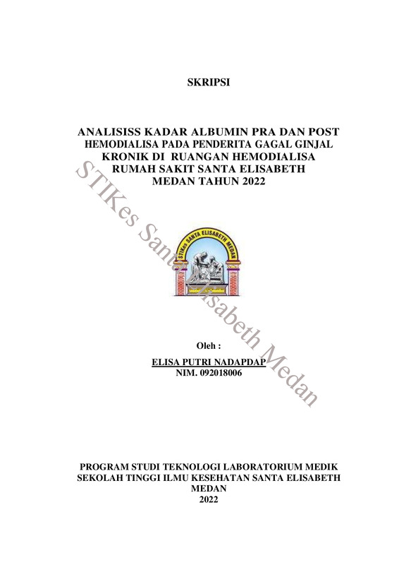 Analisis Kadar Albumin Pra Dan Post Hemodialisa Pada Penderita Gagal Ginjal Kronik Di Ruangan Hemodialisa Rumah Sakit Santa Elisabeth Medan Tahun 2022